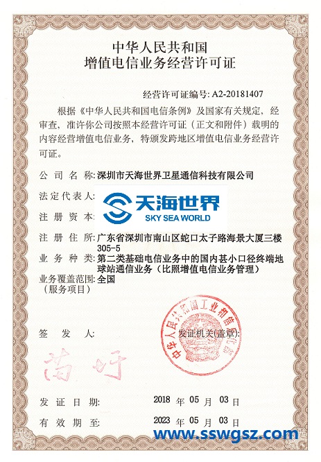 天海世界喜獲由中華人民共和國(guó)工業(yè)和信息化部頒發(fā)的《中華人民共和國(guó)增值電信業(yè)務(wù)經(jīng)營(yíng)許可證》,業(yè)務(wù)種類(lèi)為基礎(chǔ)電信業(yè)務(wù)中的國(guó)內(nèi)甚小口徑終端地球站通信業(yè)務(wù)。這一證書(shū)的頒發(fā),保證了公司衛(wèi)星通信業(yè)務(wù)合法經(jīng)營(yíng)的權(quán)利,為公司業(yè)務(wù)的開(kāi)展提供了有力的條件。