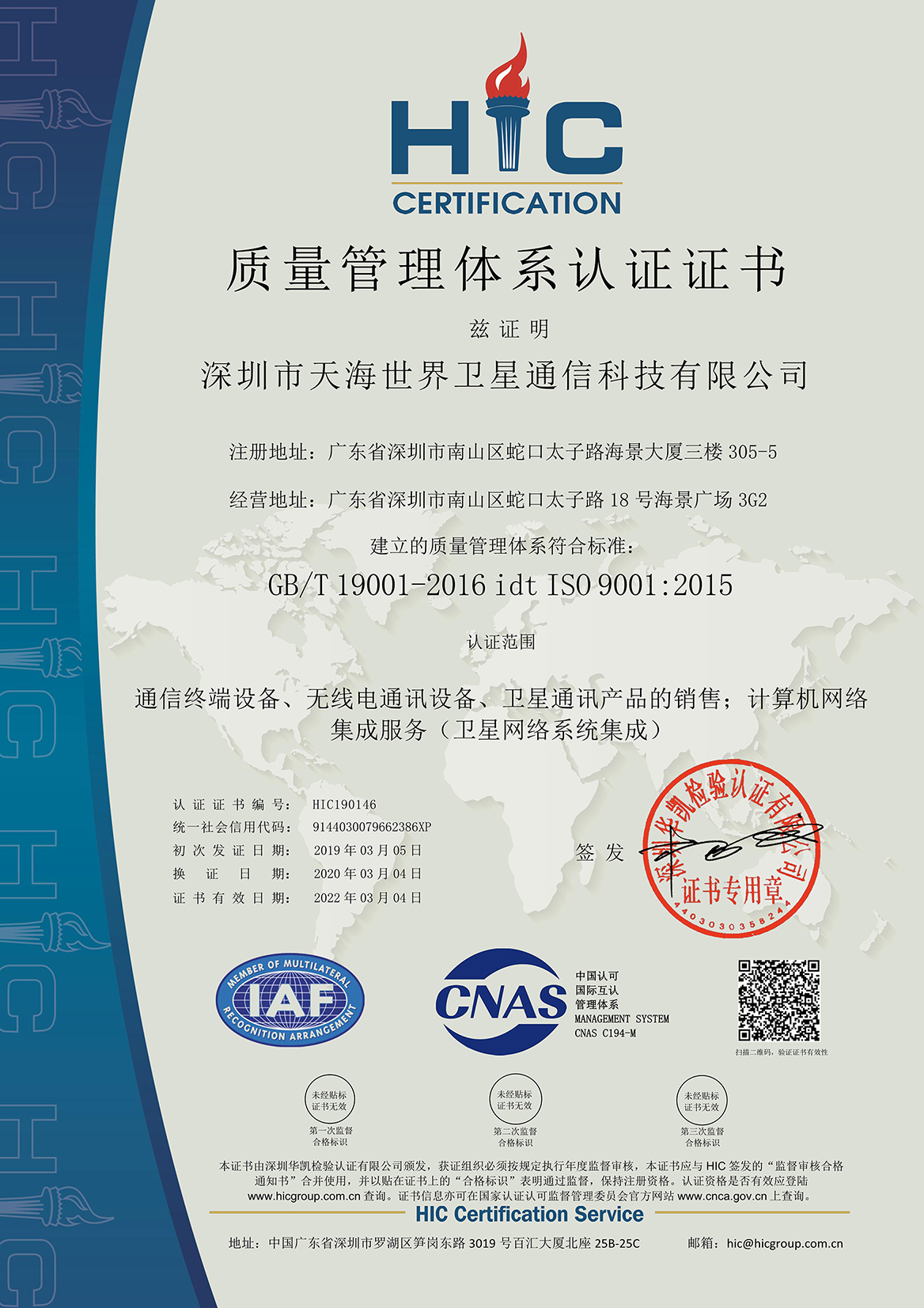 天海世界獲得《質(zhì)量管理體系質(zhì)量認(rèn)證證書》,認(rèn)證范圍為通信終端設(shè)備、無線電通設(shè)備、衛(wèi)星通訊產(chǎn)品的銷售;計(jì)算機(jī)網(wǎng)絡(luò)集成服務(wù) (衛(wèi)星網(wǎng)絡(luò)系統(tǒng)集成)。這一證書的頒發(fā),體現(xiàn)了公司質(zhì)量管理和質(zhì)量保證能力符合相應(yīng)標(biāo)準(zhǔn),是對(duì)公司品質(zhì)管理的認(rèn)可。