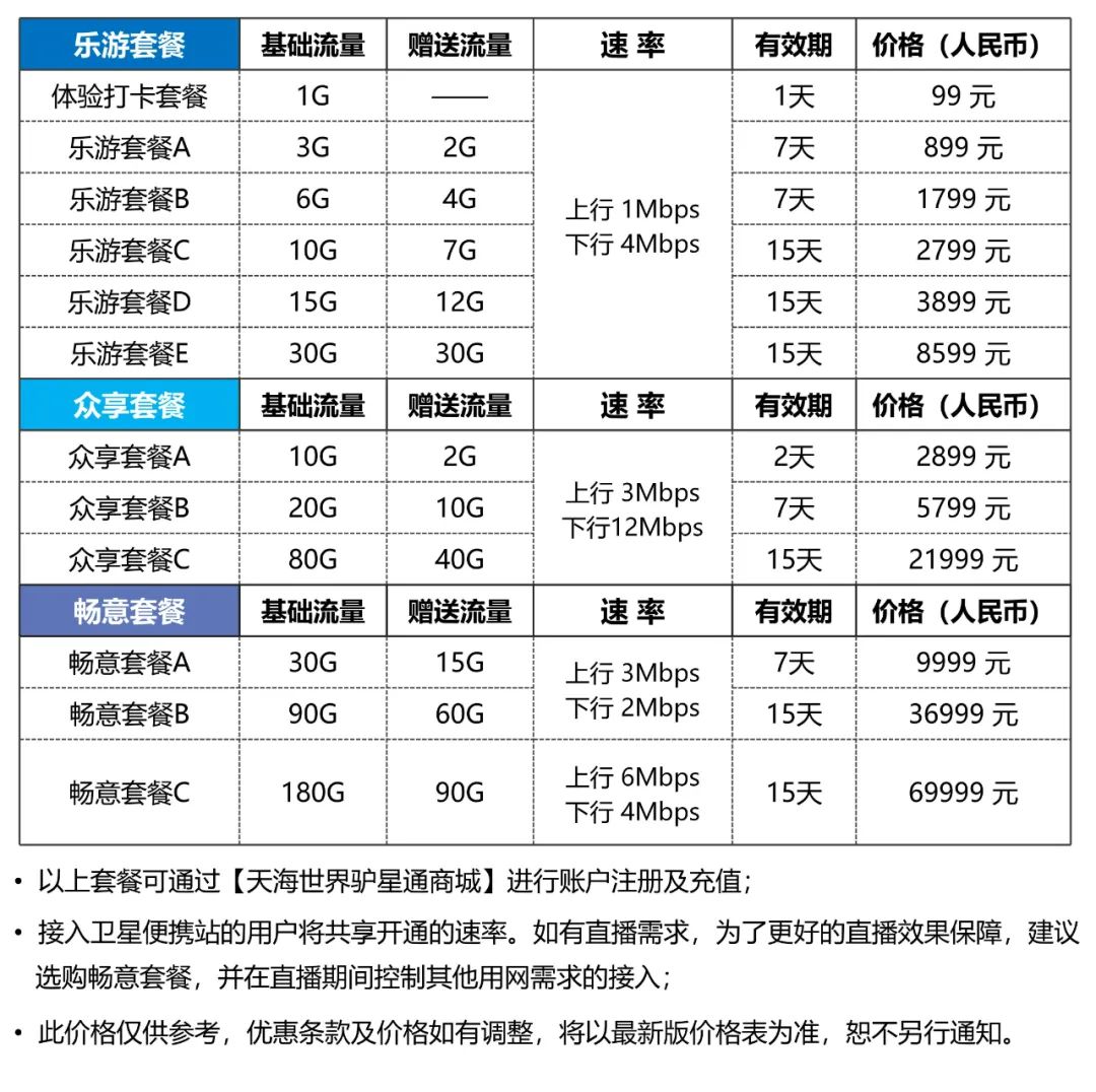 3、超出免費體驗范圍的衛(wèi)星流量,體驗官可自行在【天海世界驢星通商城充值】,流量價格參照上文 “亞太6D衛(wèi)星陸地戶外套餐”。