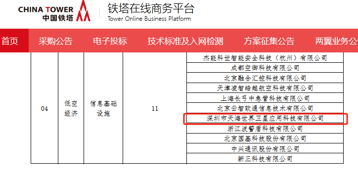 在近日公布的中國鐵塔股份有限公司“2025年智聯(lián)業(yè)務行業(yè)場景應用合作伙伴招募項目”評審結果中,深圳市天海世界衛(wèi)星應用科技有限公司成功入圍一級供應商庫。